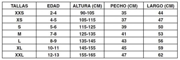 Talla | XXS NIÑO, XS NIÑO, S NIÑO, M NIÑO, L NIÑO, XL NIÑO, XXL NIÑO |